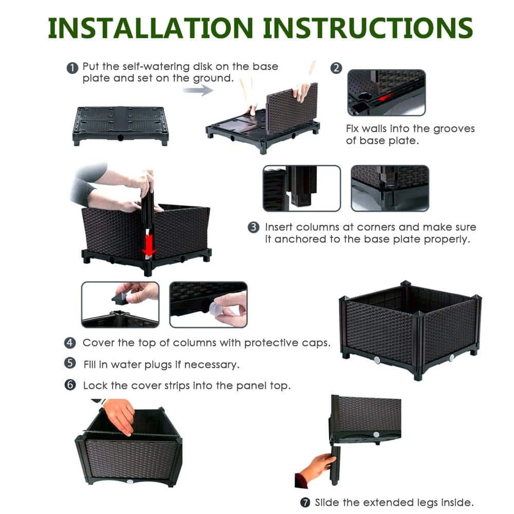 The planter bed is a good place to start developing your skills and experience the joys of growing your own plants. Constructed of high-density polyethylene (HDPE), the planter box is solid and weather-resistant to withstand the change of weather. There are 4 planting boxes for you to setup in different shape. The height of garden bed is about 17 in. (include brackets) which can protect your plants from garden animal and pests. With our planter, you don’t have to bend over or kneel for long time to grow plants and reduce pain on your back and knee. Elevated garden bed is designed with self-watering disk and drain holes to provide extra space for reserving water and help plants to absorb entirely. It can prevent plant from rot or over-drying effectively. Not only can these garden beds with rattan style help you grow plants, but they also are nice decorations in your outdoor space. It is perfect to put them in your patio, garden and balcony.