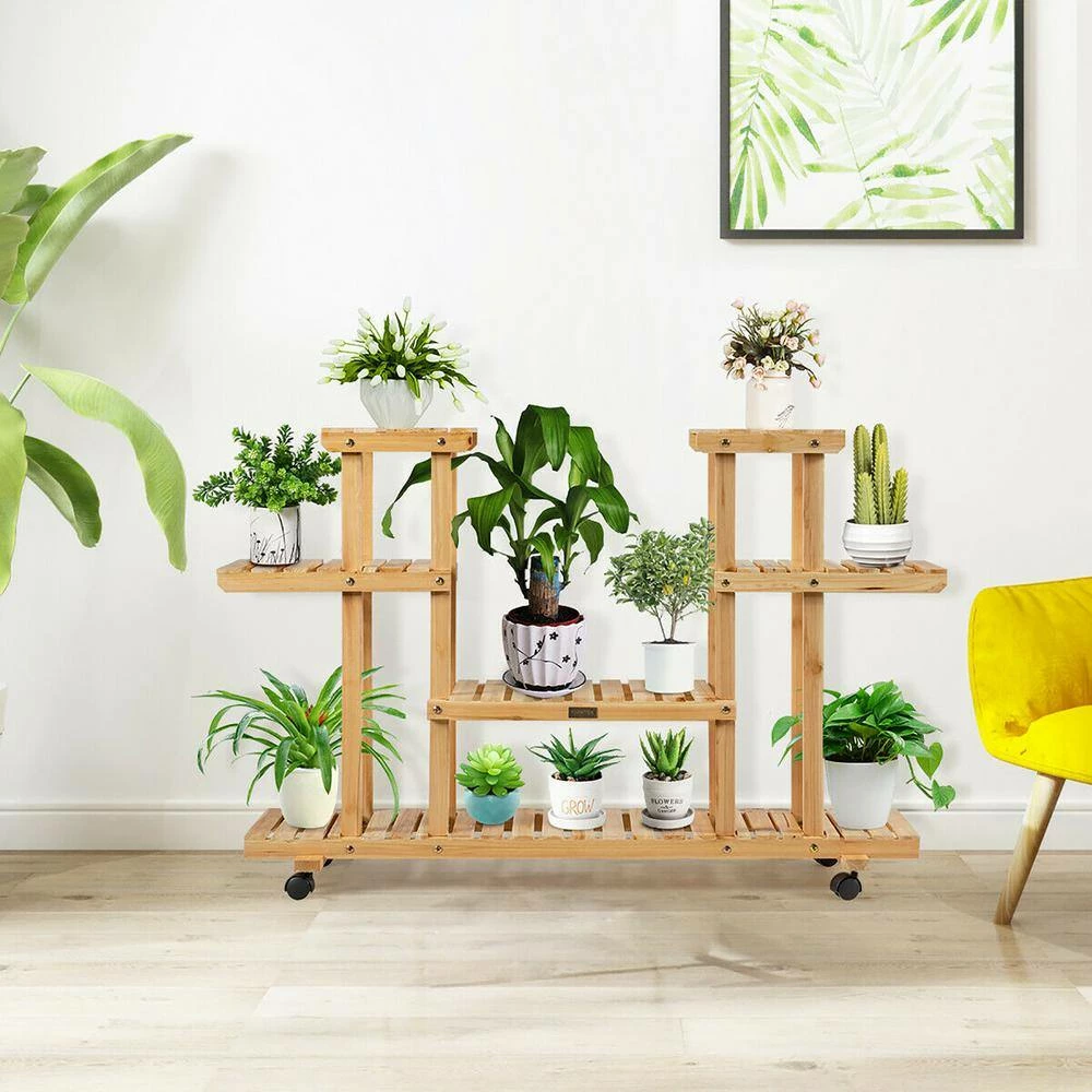 - High and low design and multi-layers making full of space and fully displays all plant or ornaments on, it multi-directional wheels saving effort for transport and lockable brakes ensuring stability
