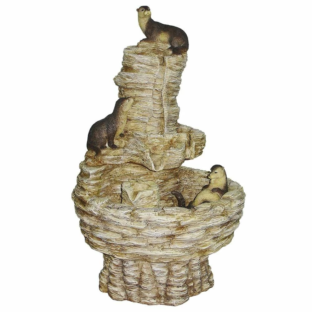 Playfully tumbling down the rocky slope, cascading water music and 3 adorable otters meet at their favorite fishing hole in this endearing fountain celebrating nature’s bounty. A cascading stream of water flows down multi-tiers of faux stone to create an in-home oasis. This Design Toscano-exclusive garden animal fountain is cast in quality designer resin and realistically hand-painted. This over 2.50 ft. tall work of garden art features an integrated, UL-listed, indoor/outdoor pump. Another quality garden fountain from Toscano. 18 in. W x 16 in. D x 28 in. H, 28 lbs.