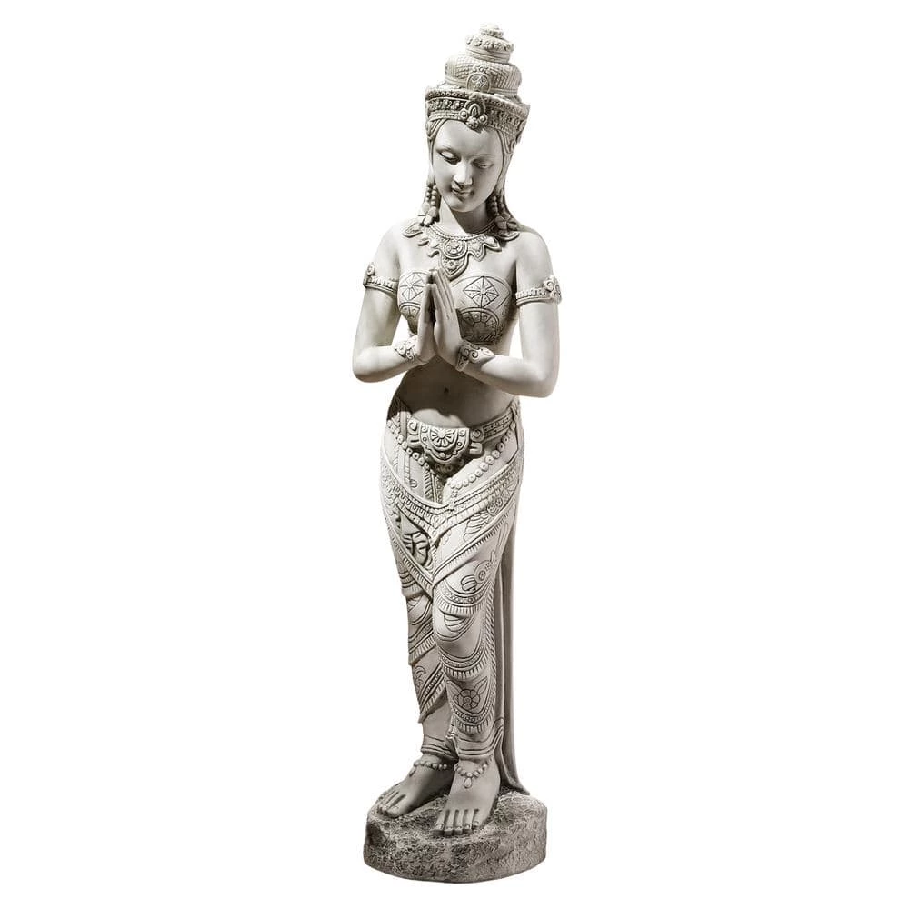 Invite divine serenity into the everyday with this Eastern garden statue replicated exclusively for Design Toscano. 1 of our favorite types of Asian sculpture, our collectible maiden statue is intricately sculpted with traditional wrapped skirt fashioned to imitate the intricate patterns often embroidered in gold thread. Our mythological angel is a distinctively beautiful Buddhist sculpture boasting an antique stone finish that’s also quite at home in an indoor gallery. 8.50 in. W x 6 in. D x 35 in. H, 15 lbs.