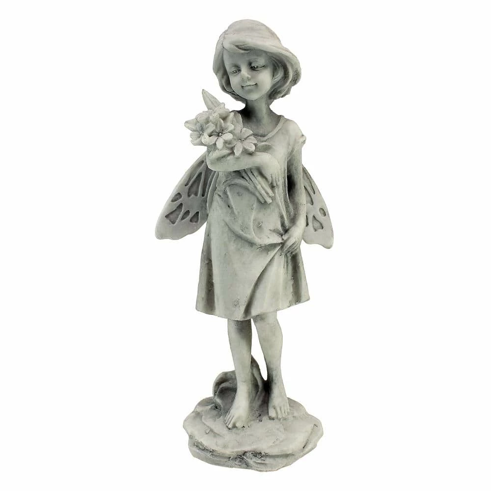 With an armload of flowers and a magic smile, our fairy girl brings an elfin spirit to spread innocence and imagination throughout the seasons. On gossamer wing, this 19th century Victorian forest nymph is actually cast of quality designer resin with a faux stone finish that captures detail from her pixie toes to an expression of joy. This demure mythical princess collectible makes a great garden gift and a charming addition to a literary shelf. Collect all 3. 4 in. W x 3 in. D x 9.50 in. H, 1 lbs.