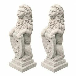 Make your home a castle with our stately lion, replicated from the weathered, centuries-old, Welsh stone original. Though he appears to be carved from heavy-weight pitted stone, he is actually painstakingly cast in faux stone finished designer resin for long wear. With his heraldic shield, this noble, 2.50 ft. tall beast adds a crowning touch when flanking an entryway or garden gate. 12 in. W x 10.50 in. D x 31.50 in. H, 15 lbs.