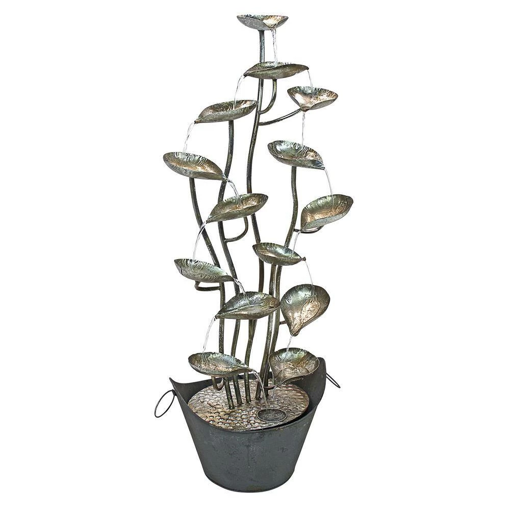 As sculpture, this all hand-crafted metal, bright silver garden water feature is unsurpassed. As a fountain it adds another dimension. At almost 4 ft. tall, the sculptural Rain Forest Leaves Cascading Metal Fountain will make enormous impact in the garden, on the deck or patio, or in an office reception lobby. Water works its way from the tallest stylized, raindrop-shaped leaf and cascades endlessly down multi-levels, touching all 14 leaves, to the center where it constantly recycles from a hidden reservoir in the silver metal bucket base. Enjoy the sweet water music and harmony of 1 of the most beautiful fountains we have ever offered, our Design Toscano fountain can be placed indoors or out. This investment in fountain art features an integrated, UL-listed, indoor/outdoor pump. Bring inside during freezing temperatures. Simple assembly required. 16 in. W x 13 in. D x 46 in. H, 10 lbs.