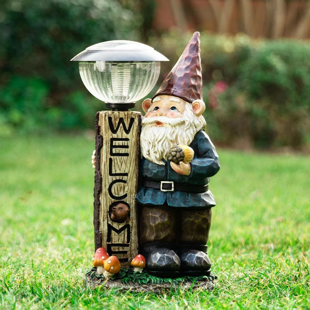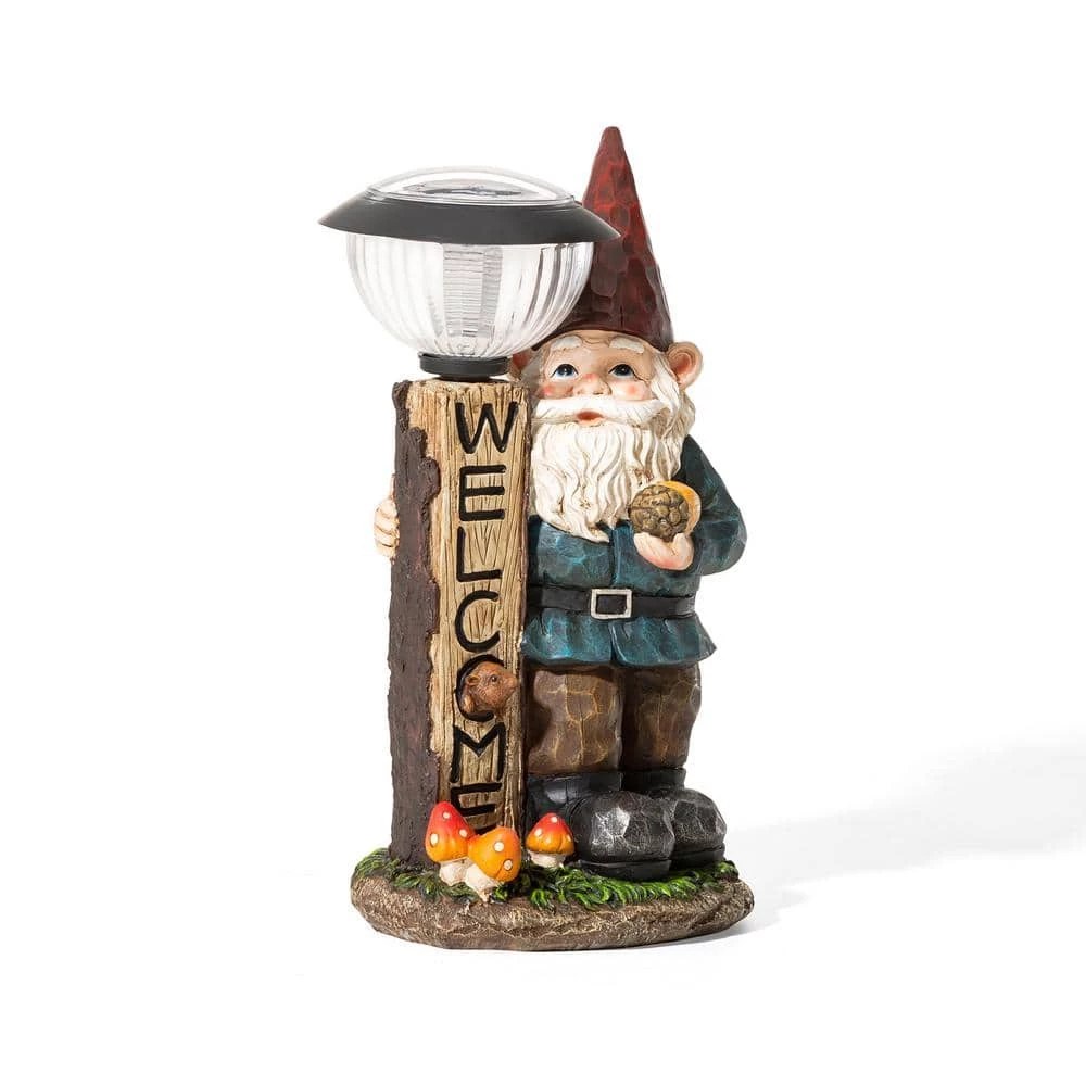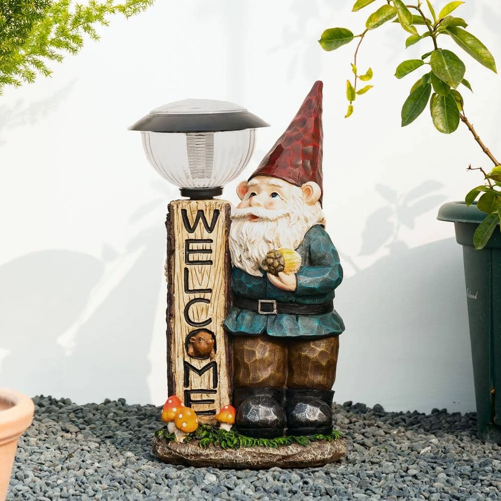 Enhancing your garden with this cute and interesting welcome gnome statue, adds a natural beauty and seasonal cheer to your space. It is constructed of high quality poly-resin that is very durable and light weight. Featured with gnome, faux wood lamp post, mushrooms and squirrel icons, as well as hand-painted retro color palette and antique details, which looks very lively, intriguing, natural and full of vintage charm. Compared to traditional garden statue, it is solar powered, the warm white light helps to create a vibrant and charming landscape at night. This funny and versatile solar gnome sculpture is sure a great decorative figurine to highlight your garden, porch, backyard or home. Also a great gift for your family or friends.