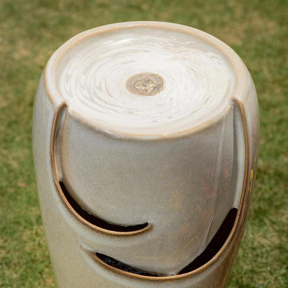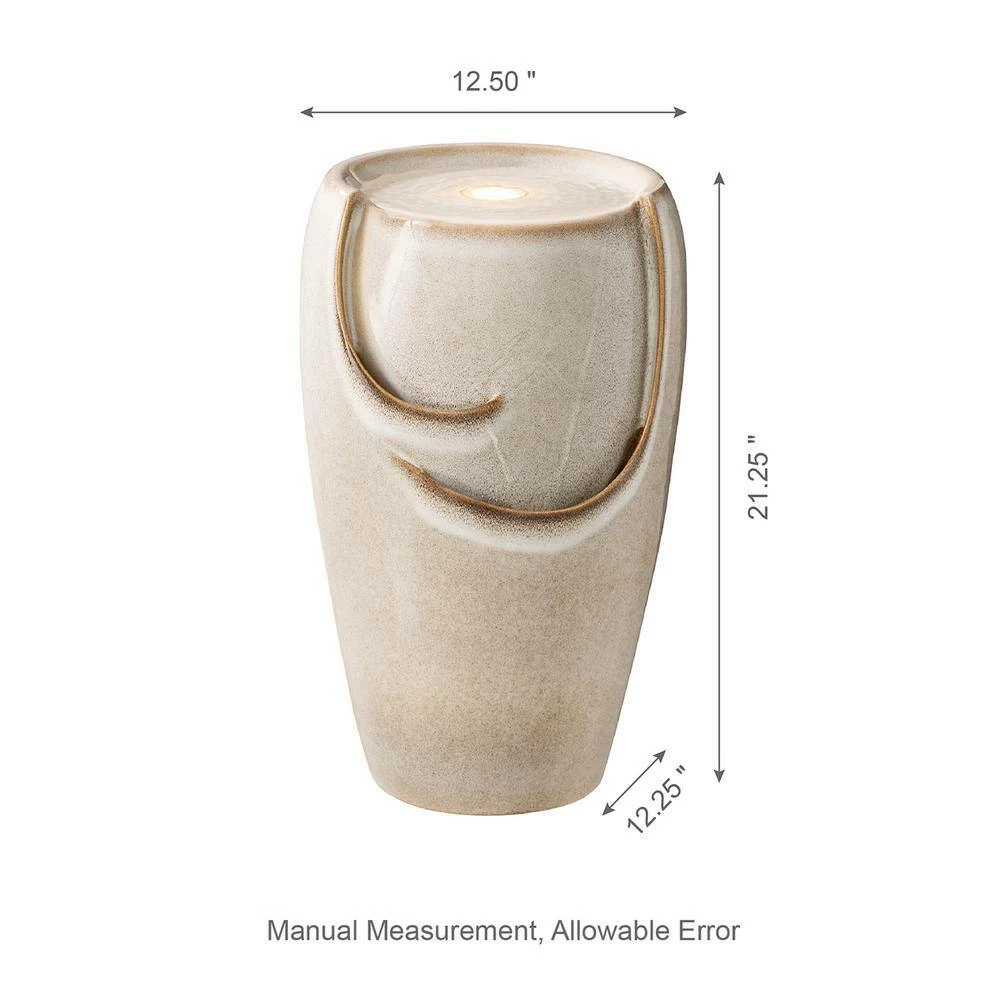 Creates a calming oasis and brings a touch of artistic to your space with this stylish and chic ceramic fountain. It featured with sand beige glaze finish that shows the charm of kiln-fire. Water flowing across the front wall and spilling into the bottom basin, the soothing sound of cascading water helps to create a relaxing atmosphere. It has a warm white LED light, the trickling water rippled and sparkled in the warm glowing light adds visual interest, which will convert your space into a tranquil, charming and pleasing environment. This versatile fountain will be a delightful addition to any of your garden, patio, deck, porch or home space. A convenient power cord and pump are included, simply add water, plug in and enjoy.