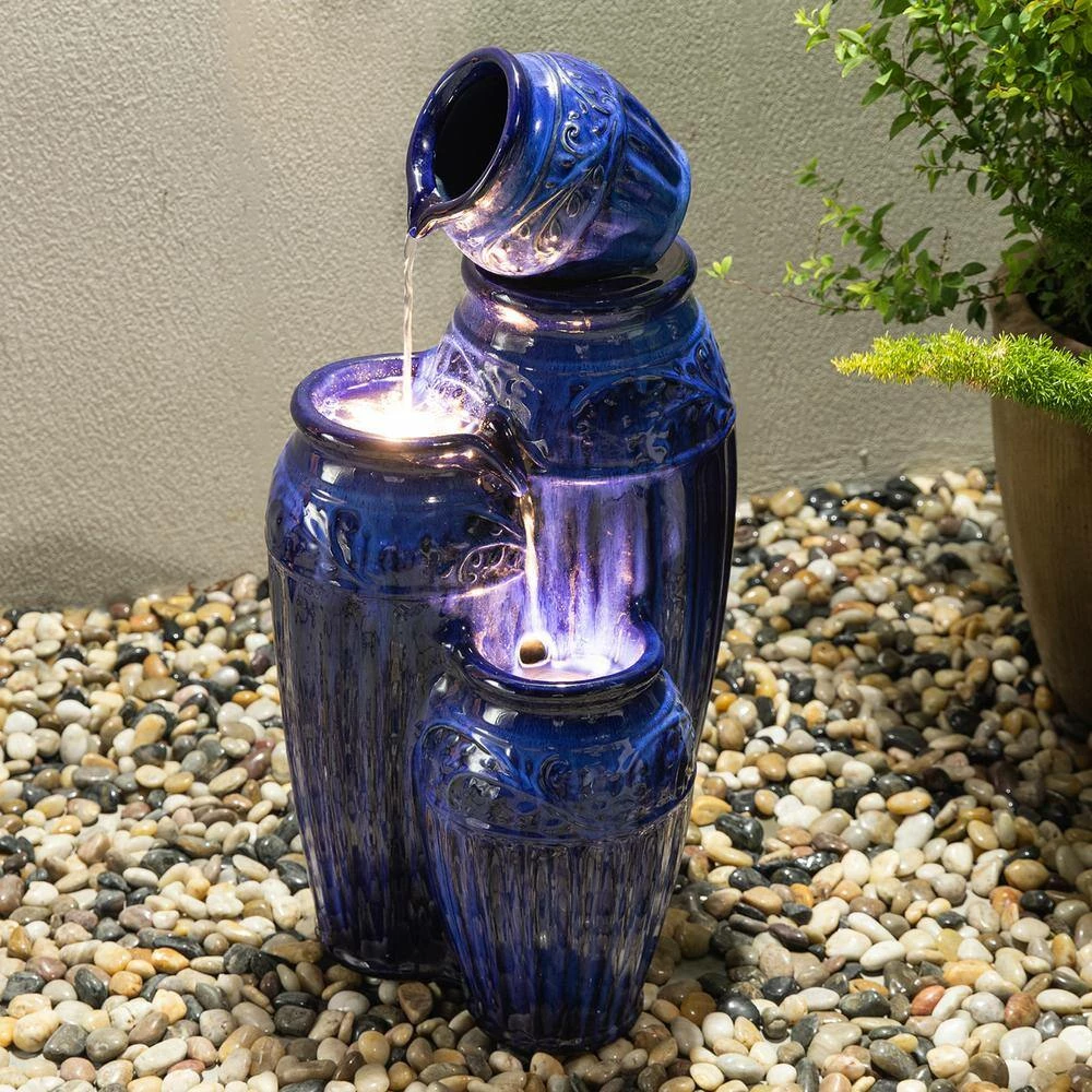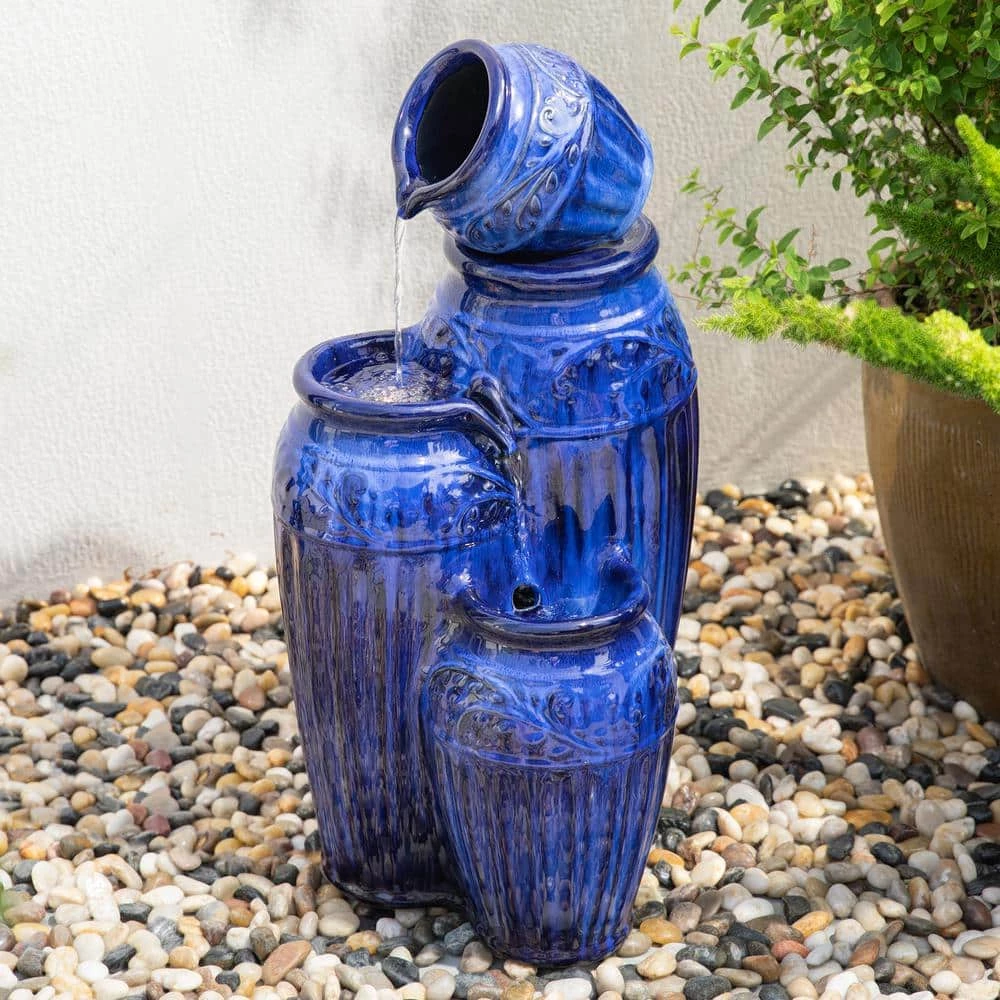This stylish and classical ceramic fountain inspired by timeless clay pots, featured with 3-tier different size pots, elegant and charming kiln-fired cobalt blue glaze, as well as the delicate embossed texture that brings a touch of artistic and natural beauty to your space. Water cascading down through 1 pot into another, the soothing sound helps to create an relaxing and meditative atmosphere. There is warm white LED lights for the 2 lower pots, the trickling water rippled and sparkled in the warm glowing light adds visual interest, which will convert your space into a tranquil, romantic, charming and pleasing environment. This versatile fountain will be a warm and delightful addition to any of your garden, patio, deck, porch or home space. A convenient power cord and pump are included, simply add water, plug in and enjoy.