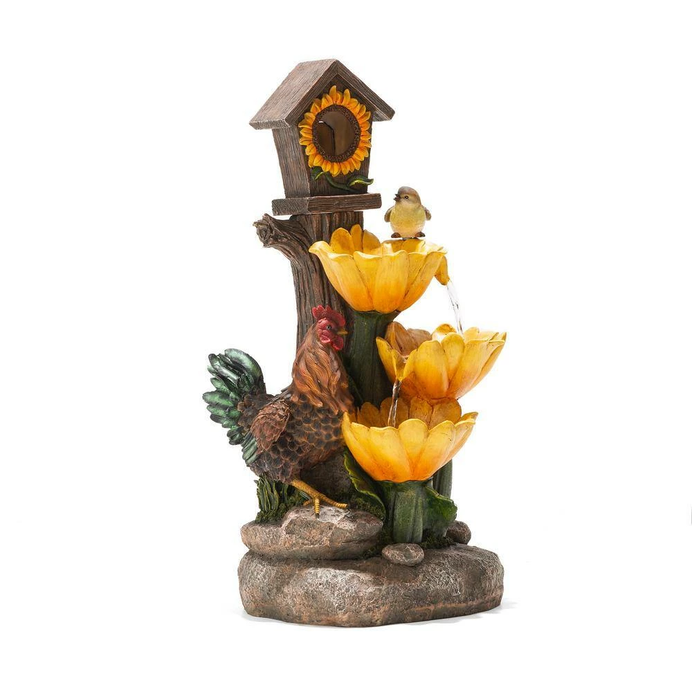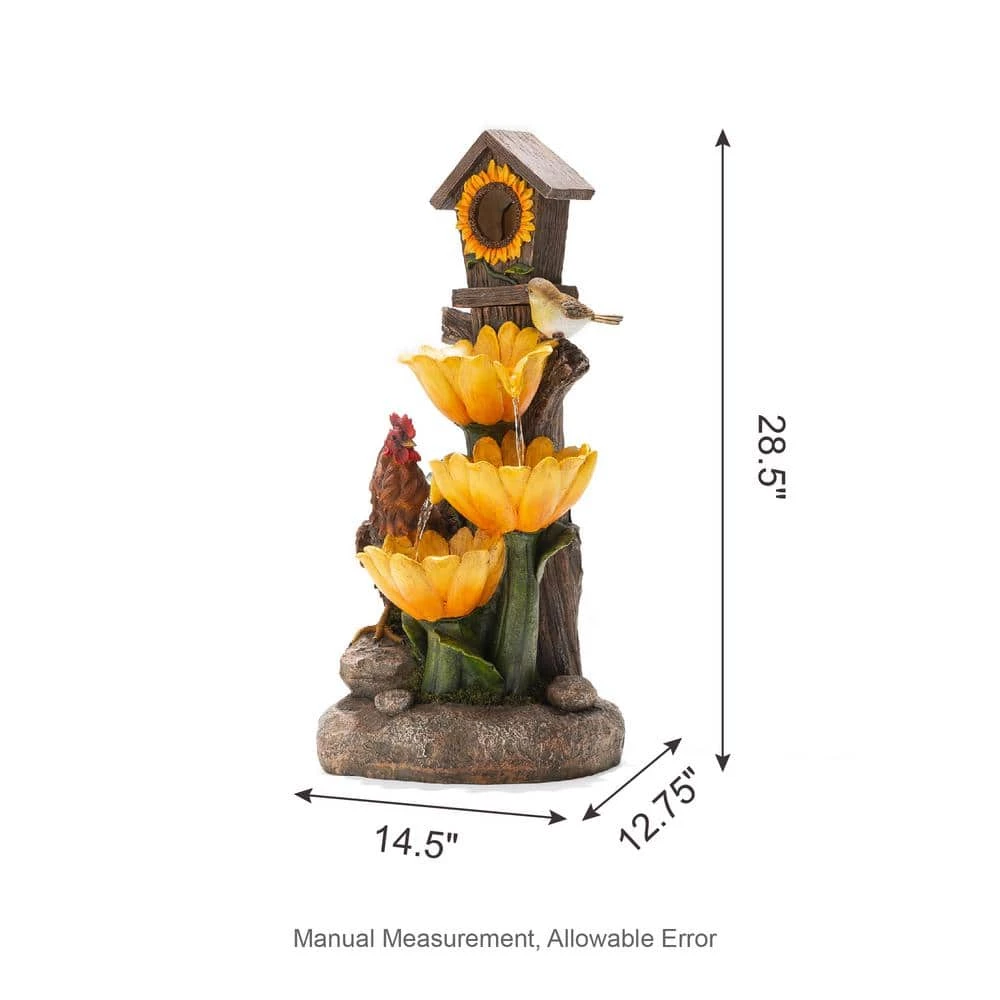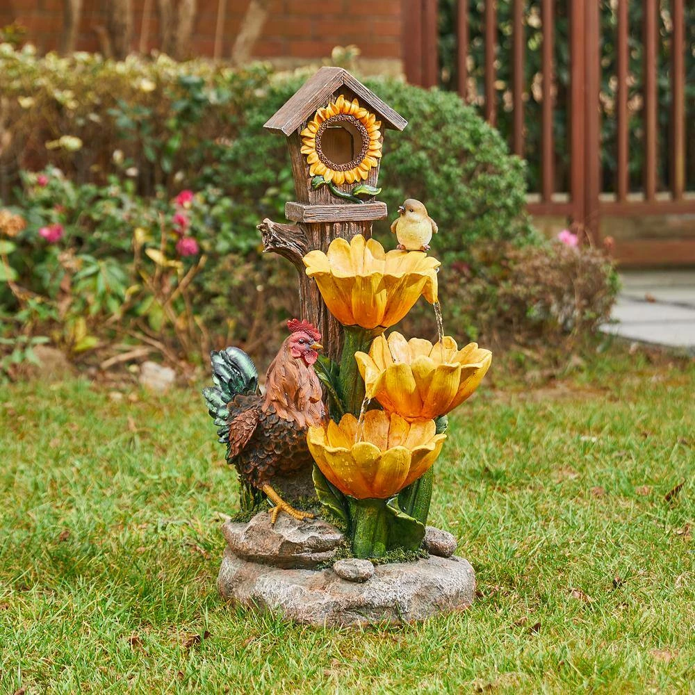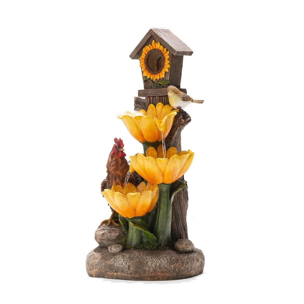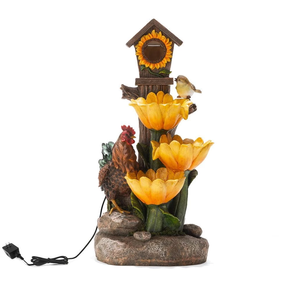 Creates a calming oasis and brings a touch of artistic to your space with this farmhouse sunflowers and birdhouse resin fountain. It featured with interesting and vivid sunflowers, birdhouse, rooster that brings a touch of natural beauty and adds rustic charm to your space. The stacked design lets water come to life that looks vivid and interesting. Water cascading down through 1 flower and spilling into another, the soothing sound of cascading water helps to create a relaxing and meditative atmosphere. Each tier has a warm white LED light, the trickling water rippled and sparkled in the warm glowing light adds visual interest, which is sure to convert your space into a tranquil, charming and pleasing environment. This versatile fountain will be a delightful addition to any of your garden, patio, deck, porch or home space. A convenient power cord and pump are included, simply adds water, plug in and enjoy.