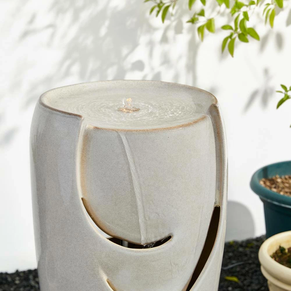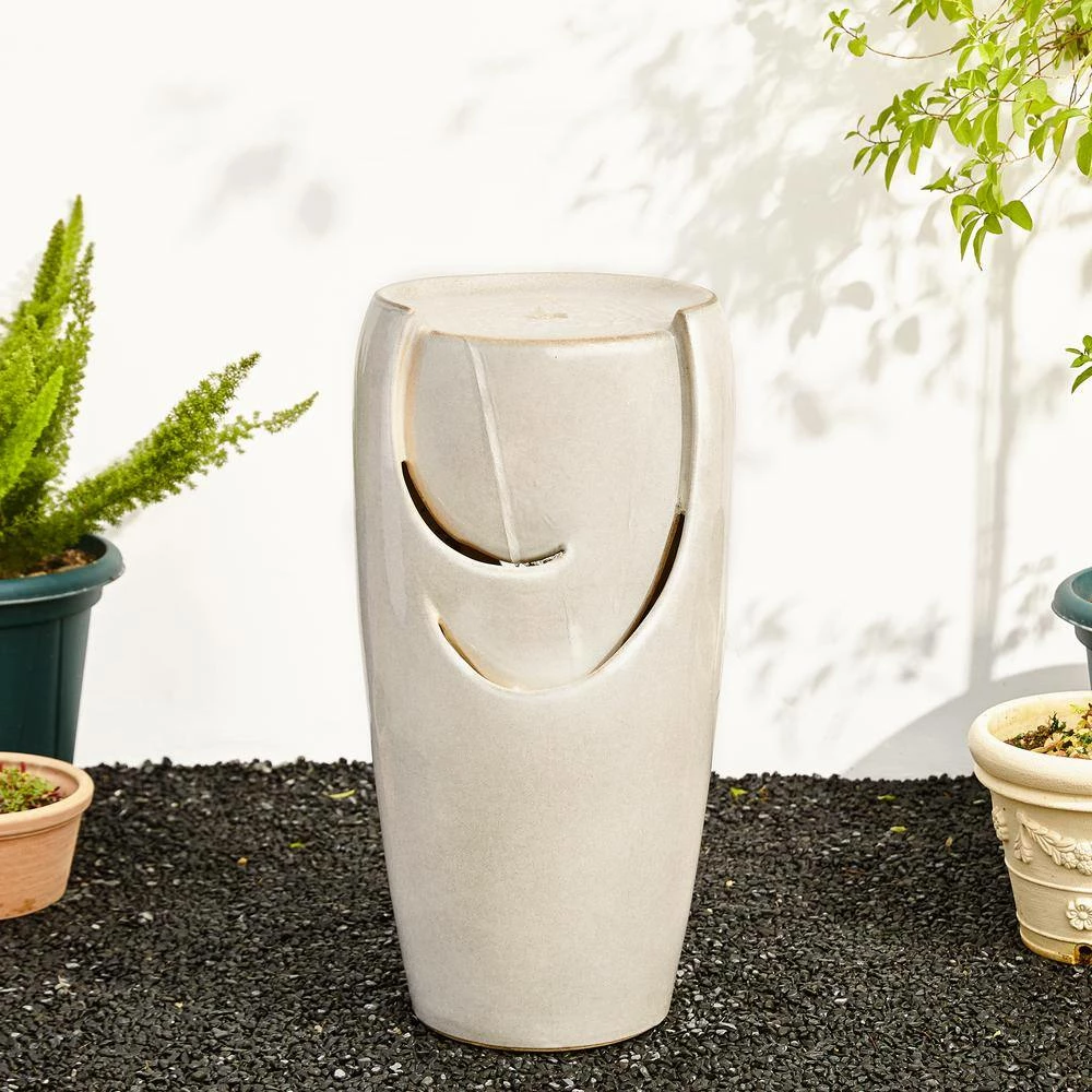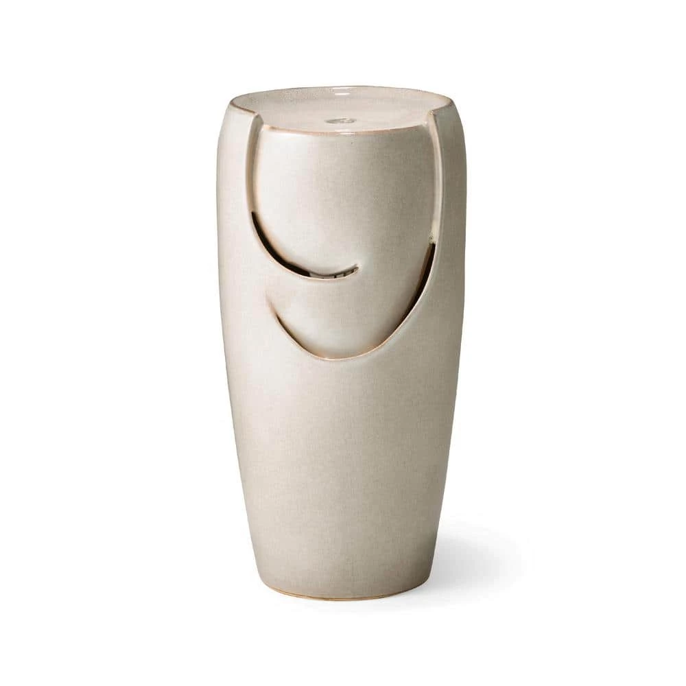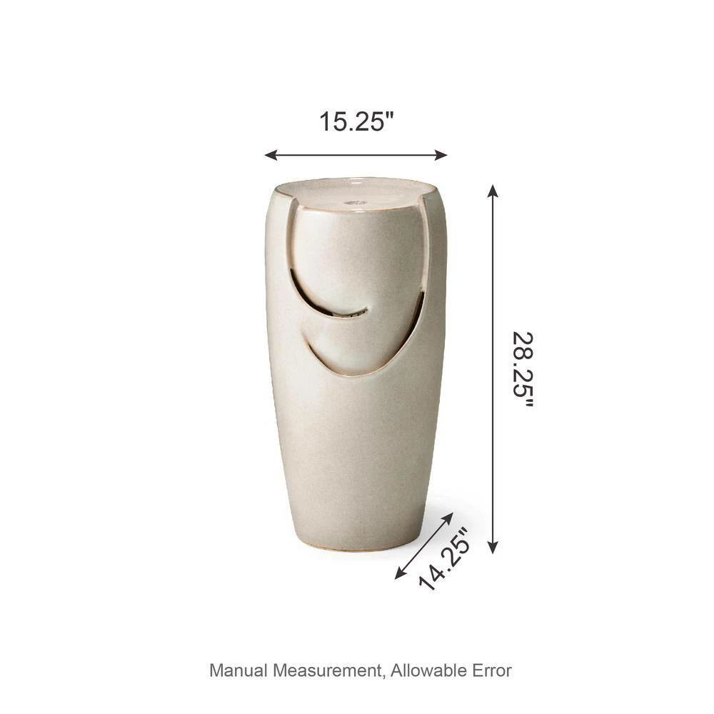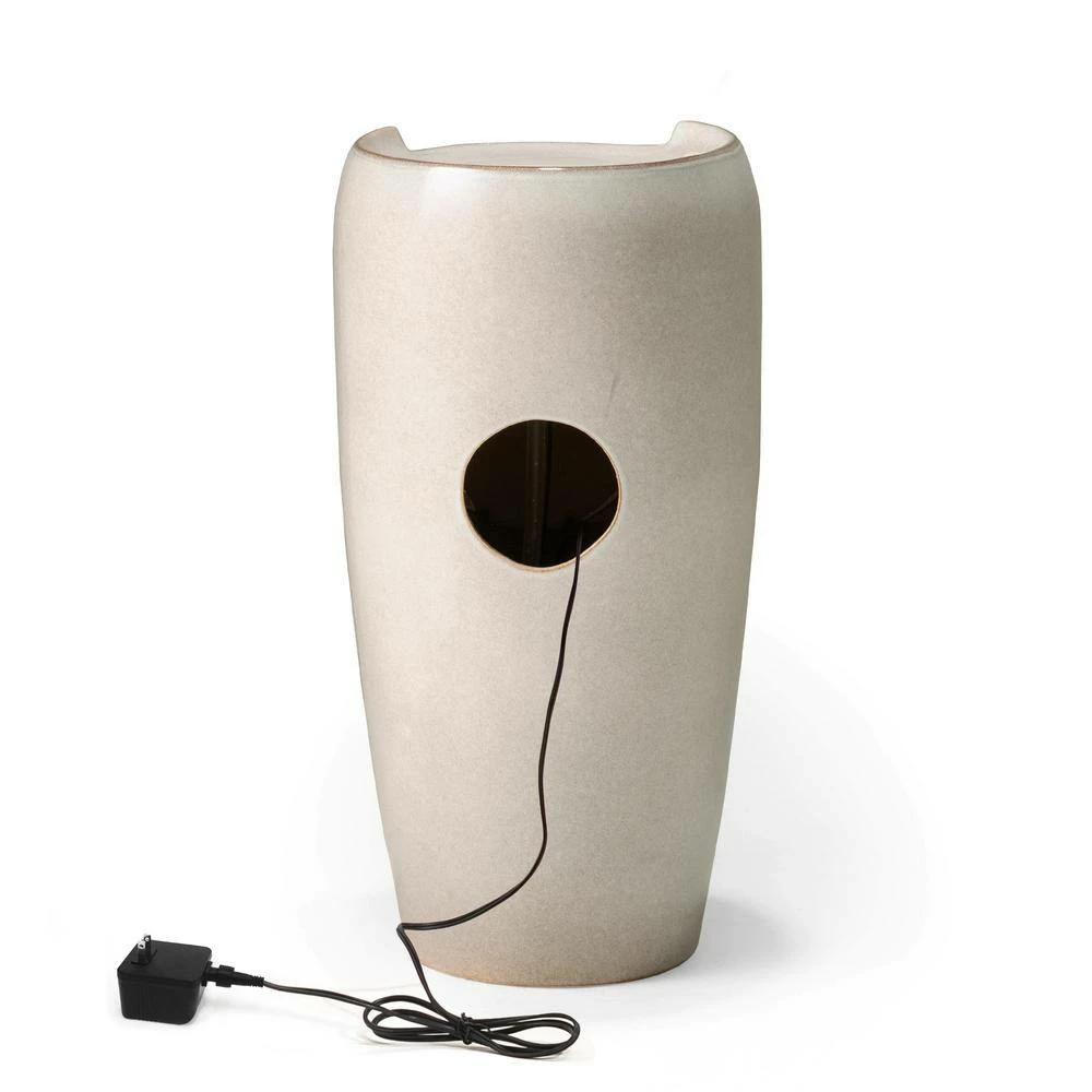 Creates a calming oasis and brings a touch of artistic to your space with this fashion and chic ceramic fountain. It featured with elegant sand beige glaze finish that shows the charm of kiln-fire. Water flowing across the front wall and spilling into the bottom basin, the soothing sound of cascading water helps to create a relaxing and meditative atmosphere. It has a warm white LED light, the trickling water rippled and sparkled in the warm glowing light adds visual interest, which is sure to convert your space into a tranquil, charming and pleasing environment. This versatile fountain will be a delightful addition to any of your garden, patio, deck, porch or home space. A convenient power cord and pump are included, simply adds water, plug in and enjoy.