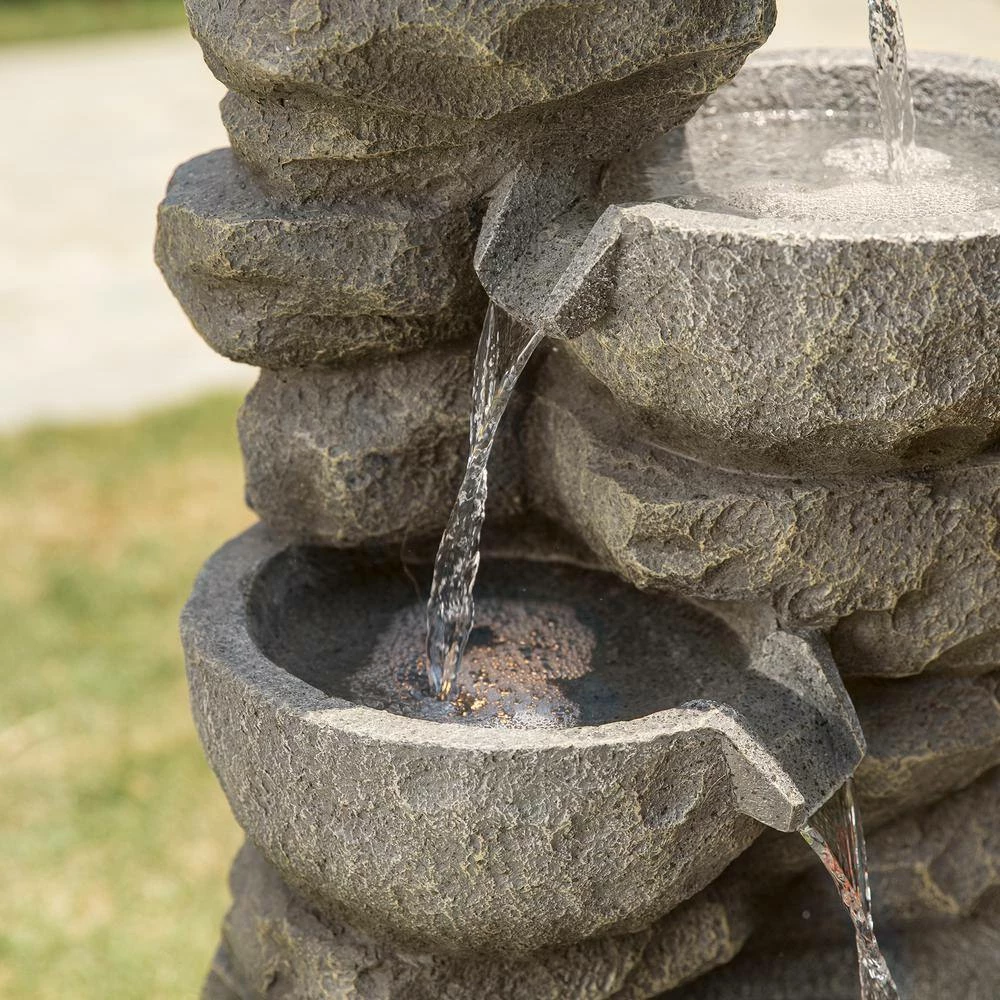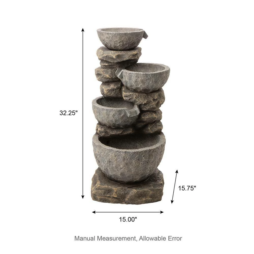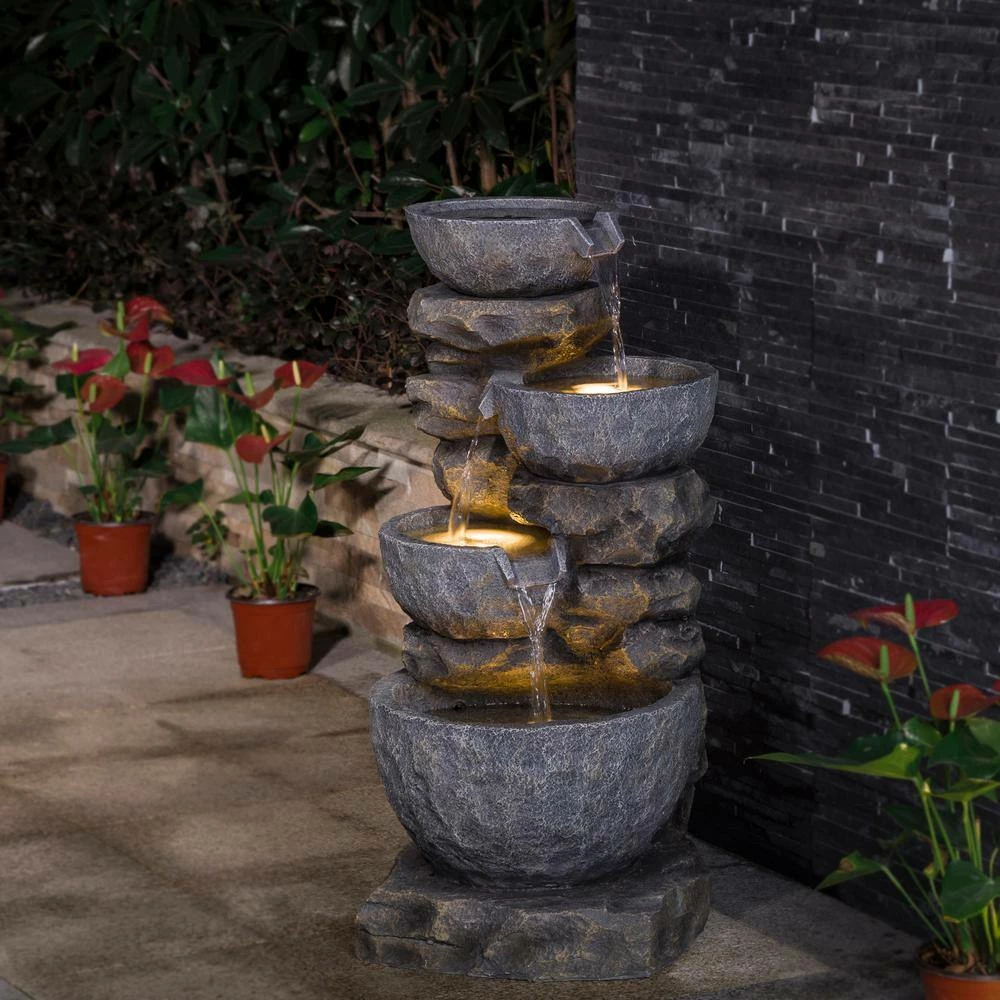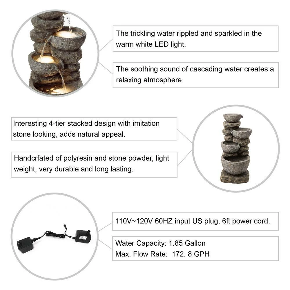 Create a sense of coziness and relaxation in your backyard with the warm glowing LED light of the fountain. It is sure to convert your garden into a visually pleasing environment. The decorative outdoor fountain is made by delicate craftwork with light weighted resin which gives it a very strong and reliable structure and also easy to move. The fiberglass construction is weather-proof, rust-resistant and durable for years of quality use. he soft sound of cascading water is sure to relax you after a long day and provide an aesthetic feature for you to admire whilst relaxing in your garden.