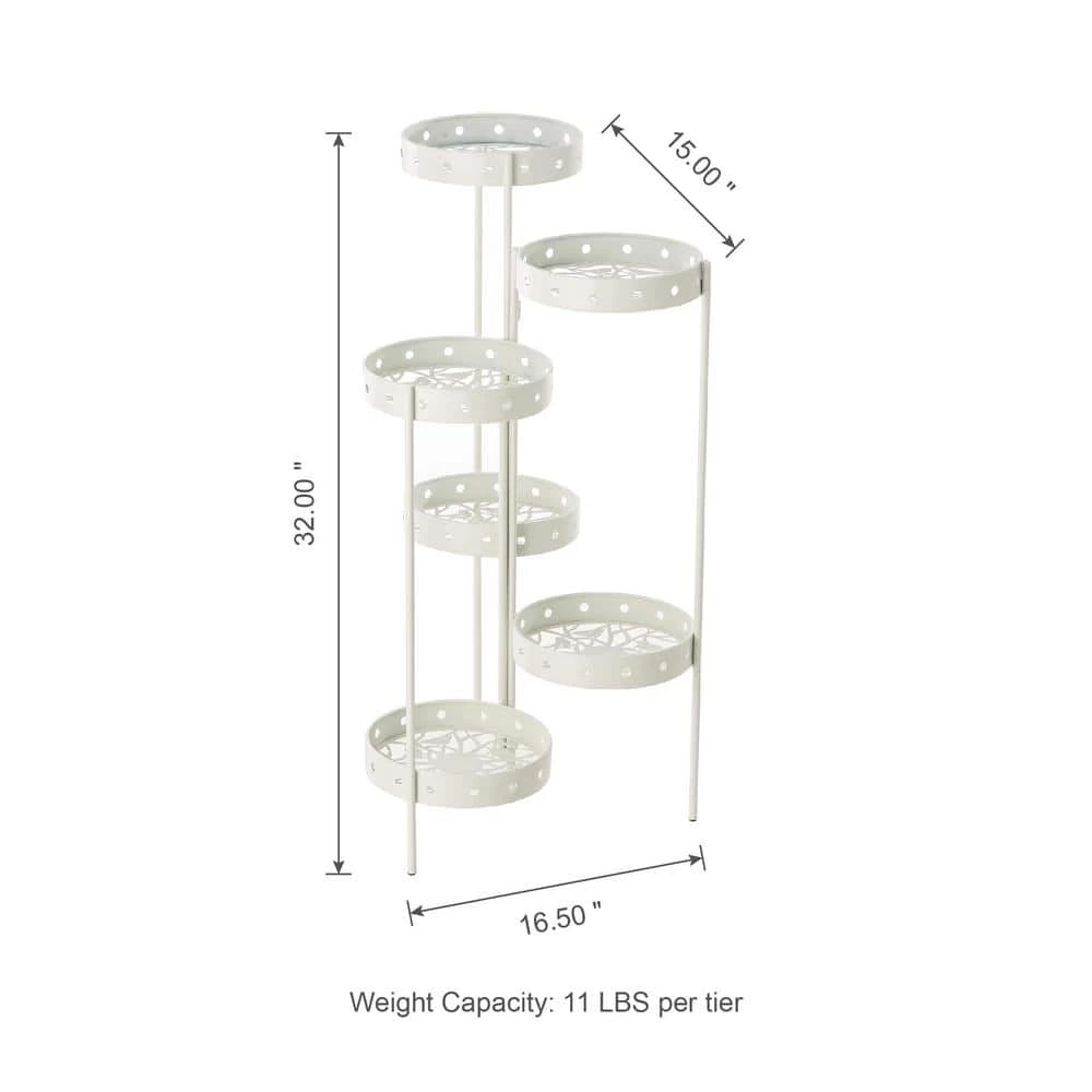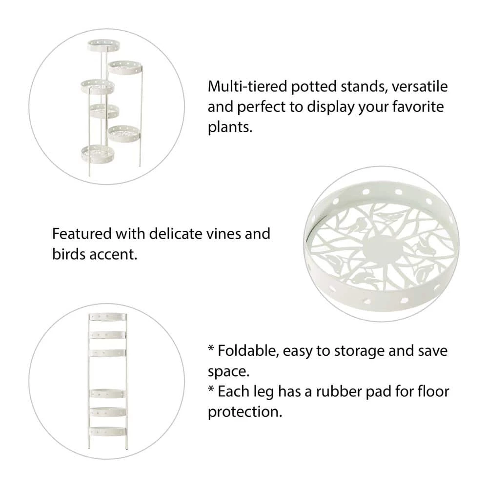 Give your blooming natural beauties a charming display space with this elegant matte white metal planter stand. It comes with 6-tiered of round trays, each tray has a cutout bottom that featured with delicate vines and birds patterns. Just feel free to display your favorite flowers, plants or anything you’d like, it will be sure to convert any of your garden, patio or home space to be a charming and delightful environment.