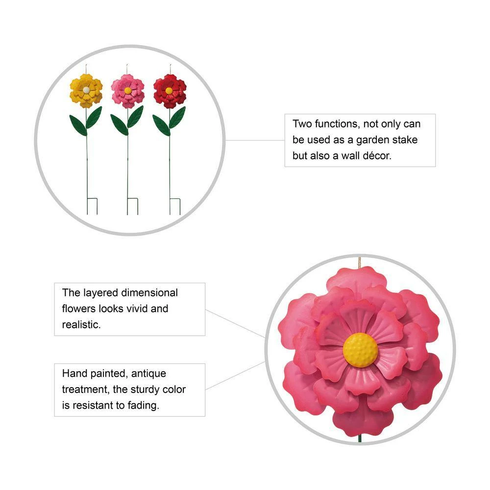 This set of 3 yard stakes with different color for each that will add a touch of pop color to your space. Featured with layered dimensional flowers that looks vivid and realistic. It has a detachable metal stake and hanging loop, not only can be used as a garden stake or wall decor. This versatile item will be a perfect addition to your home or garden.
