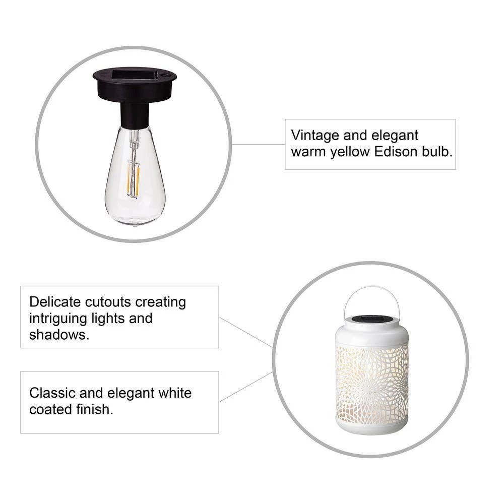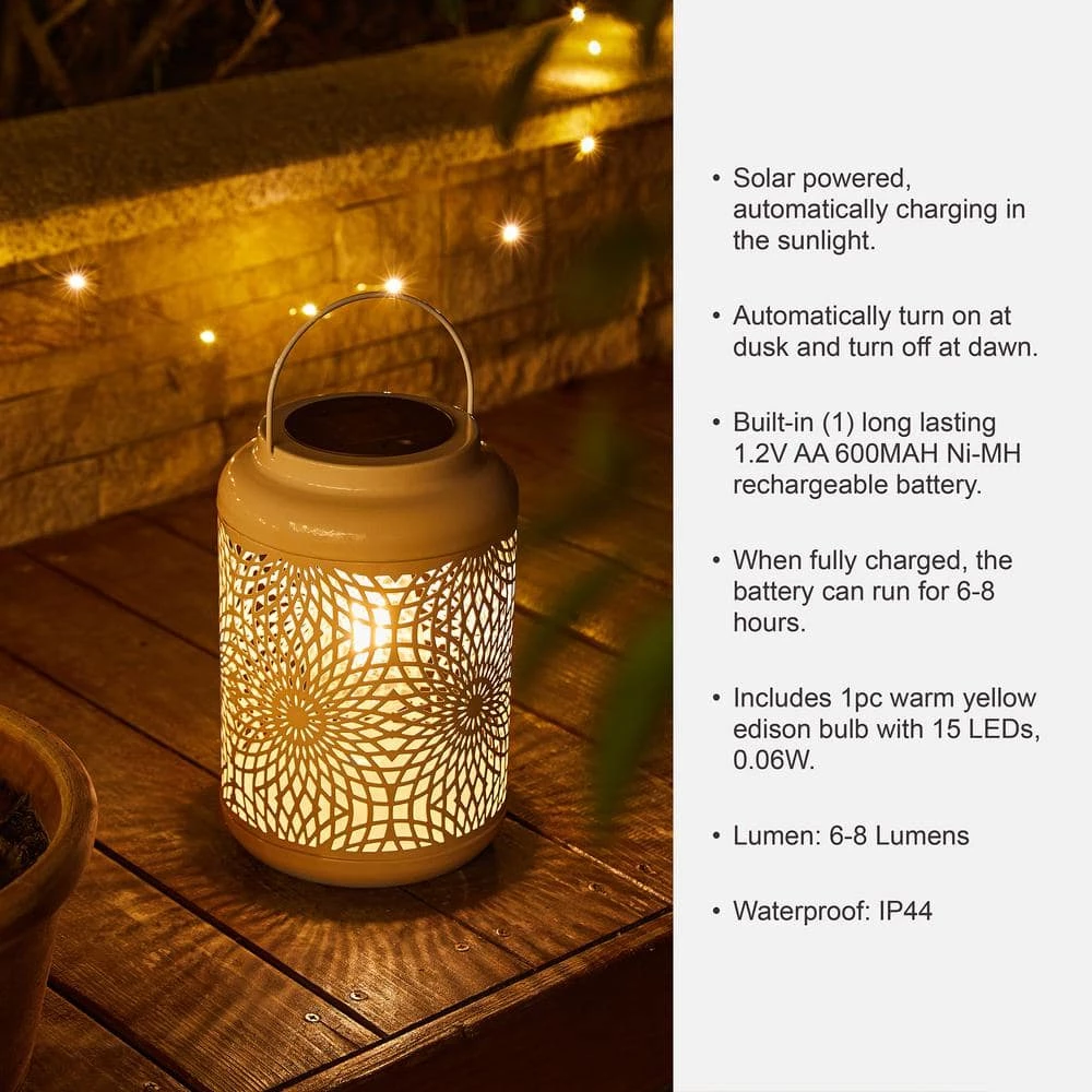 This classic solar lantern with delicate cutouts creating intriguing graphic shadows, adds artisan beauty and flickering drama to your outdoor space. Use it to convert your garden, patio or yard to be a bright, charming and delightful environment. It will be a great addition for your dining table, cocktail time or yard games.